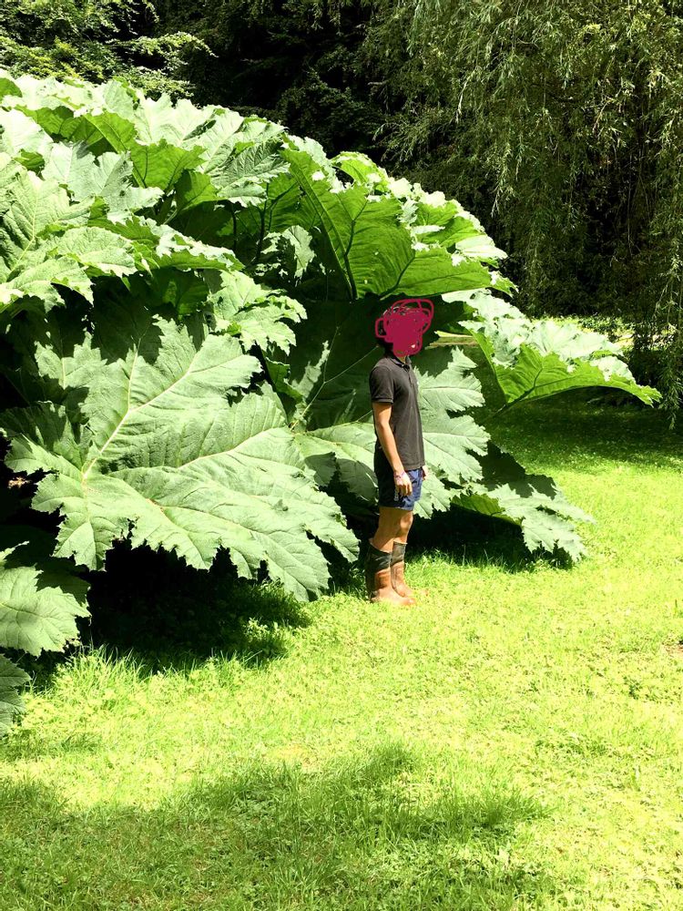 息子に立ってもらって大きさ比較、名前はわからないけどこんな葉っぱ見たことなかったよ。それにしても個人宅にこのスケール葉っぱ🌱凄いです。🌈💚