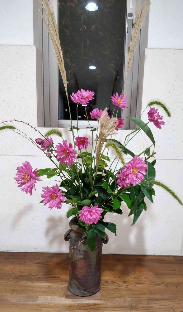 これをメインに高さのあるススキを合わせたものですが、エノコログサとススキは同時に使うと、雑草を入れました感が強くなります。ここでは秋明菊と穂のないススキの葉を効果的に使った方がスッキリまとまると思います。