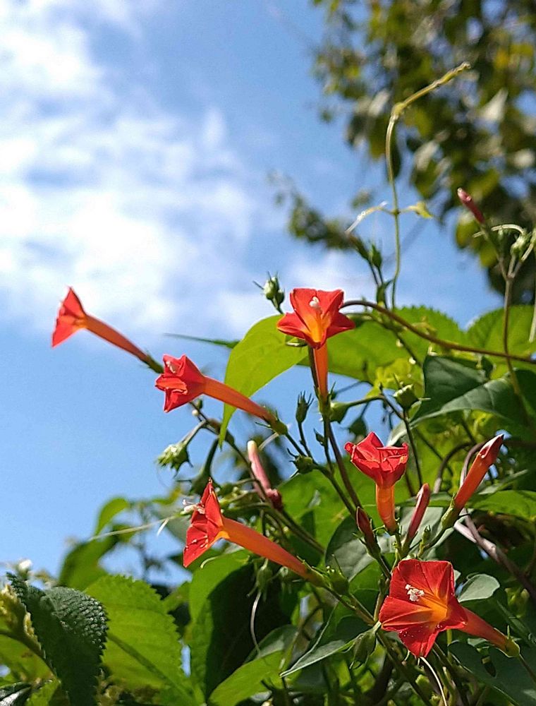 畑のフェンスに絡まってラッパ状の五角形の花が花開いています。