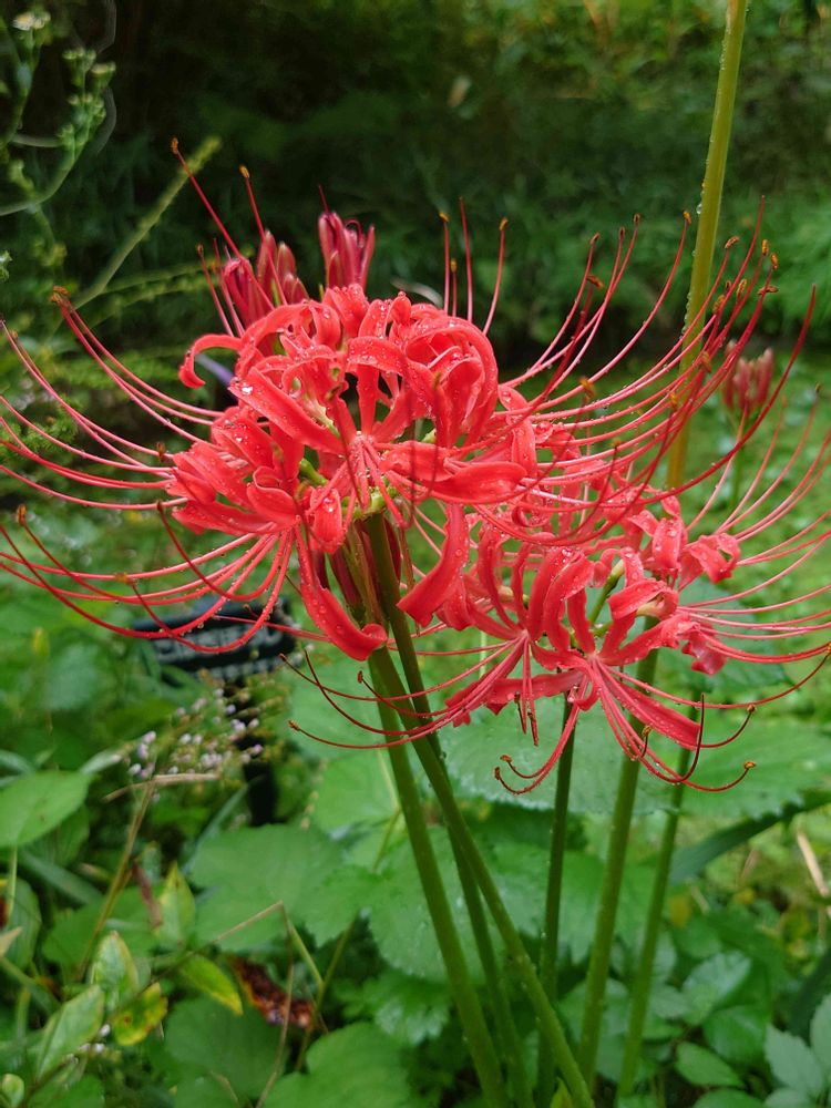 池のヒガンバナの花、雨に濡れて一層美しさを増しています❤🌿