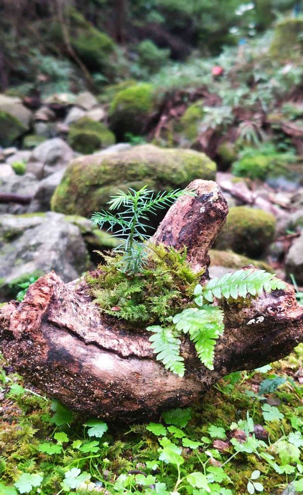 苔の中に杉が生えてたのでシダと一緒に流木に乗せてみました😁