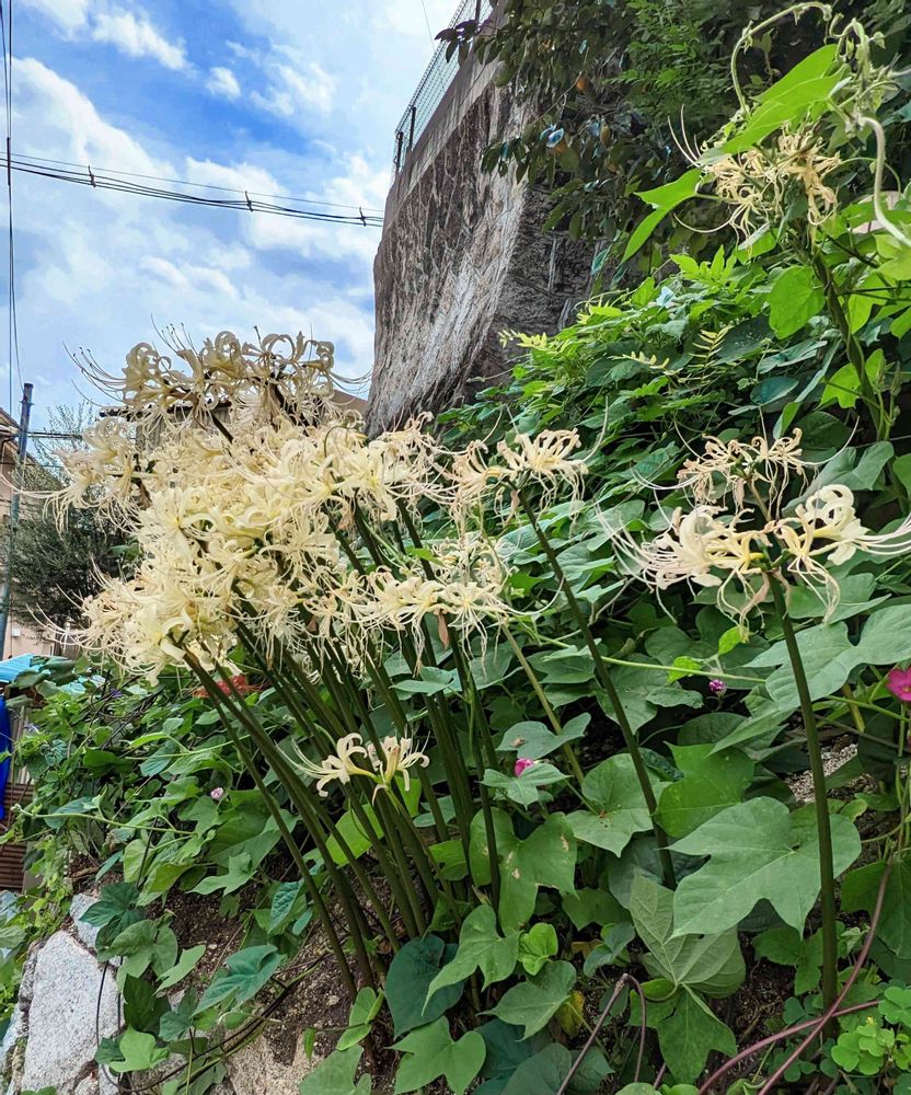 散歩道🚶🏼♀️を逸れて崖の下に咲いている👀珍しいクリーム色の彼岸花です(去年9月📱)