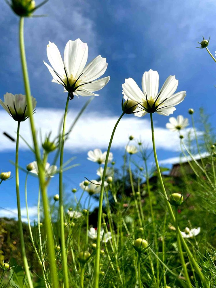 青い空とコスモスの白のコントラストが素晴らしいですね。