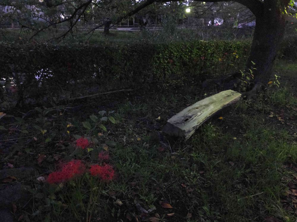 朽ちたベンチと曼殊沙華