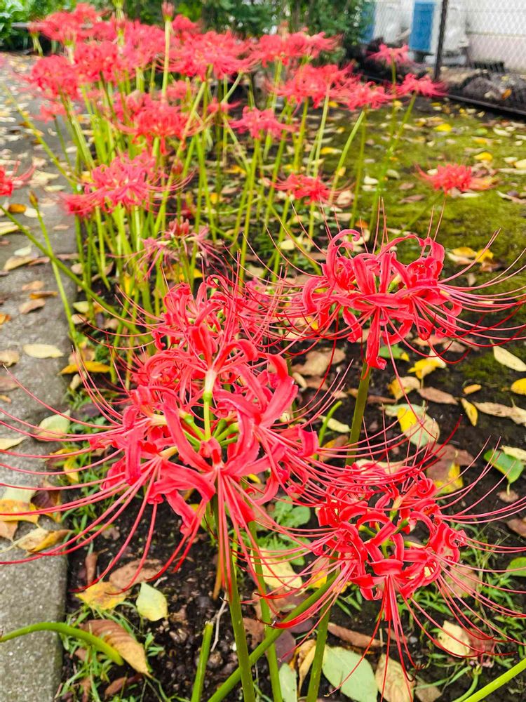 ソメイヨシノの落ち葉🍂と真っ赤なヒガンバナ