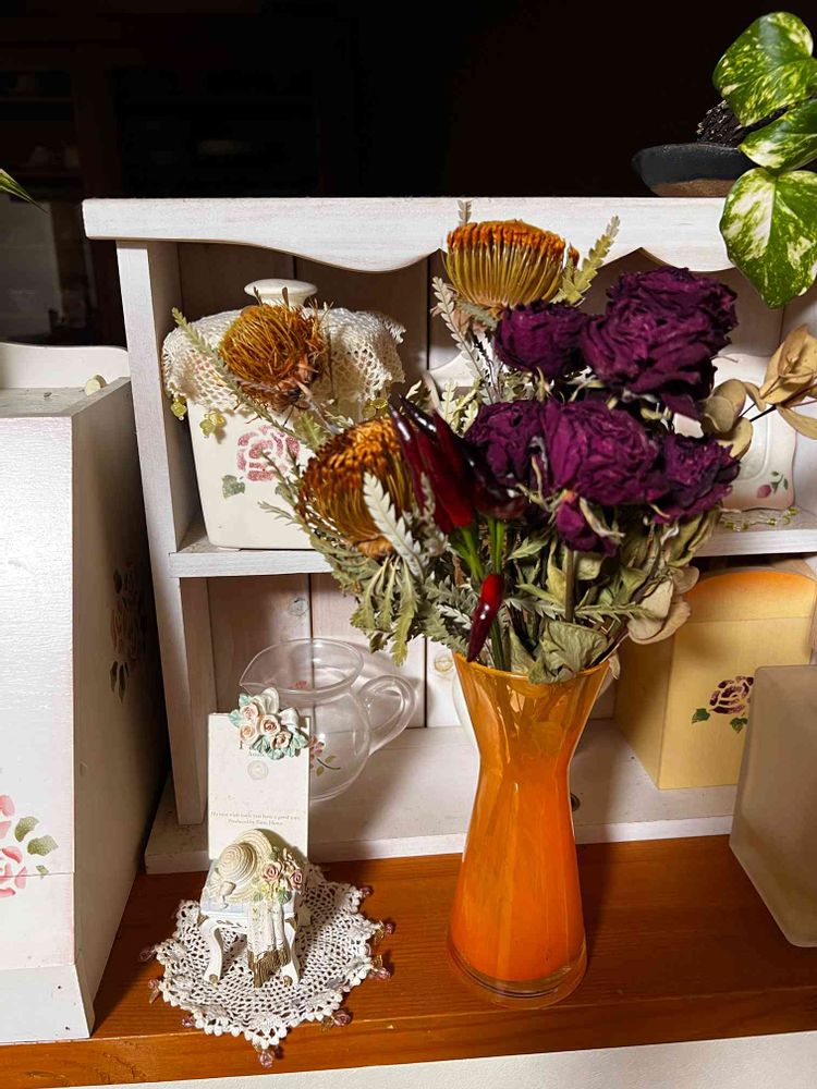 お手製のバラのドライフラワーに追加で購入したものを飾ったらいい感じになりました。