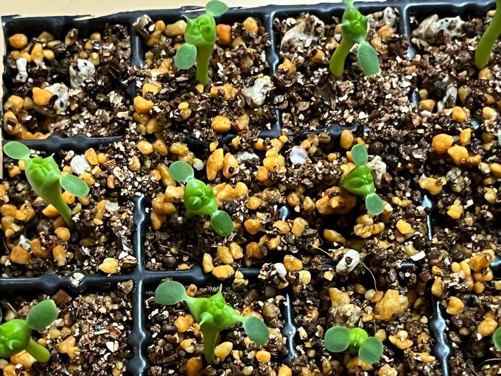 20粒のうち18粒発芽し、双葉の割れ目あたりが、少しオベサっぽくなってきました。