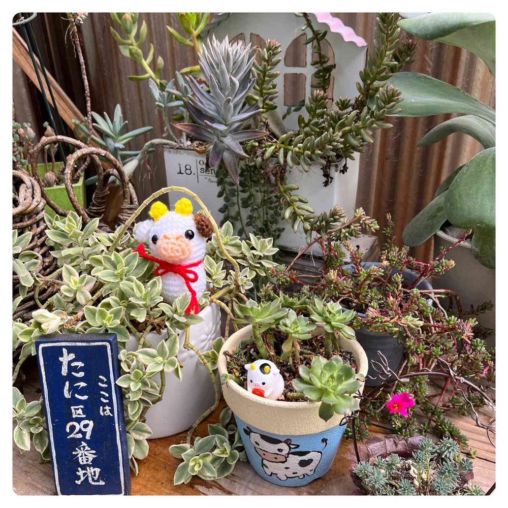 ジュンさんのあみあみ🐮さんを乗っけた班入りベビーサンローズ、今日はお花咲いていません。忘れた頃にポツリと咲いているのを見つけると、幸せ💞