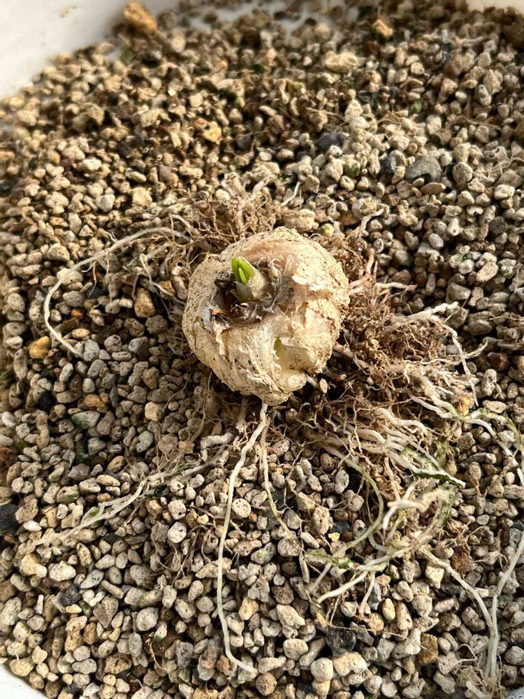 この球根も数年前に欠片みたいになっていたのを諦めきれずに鉢に乗せていて、隣の鉢にかけてる霧吹きのお零れ💧でチンマリと芽🌱を出して今に至るのよ😁
