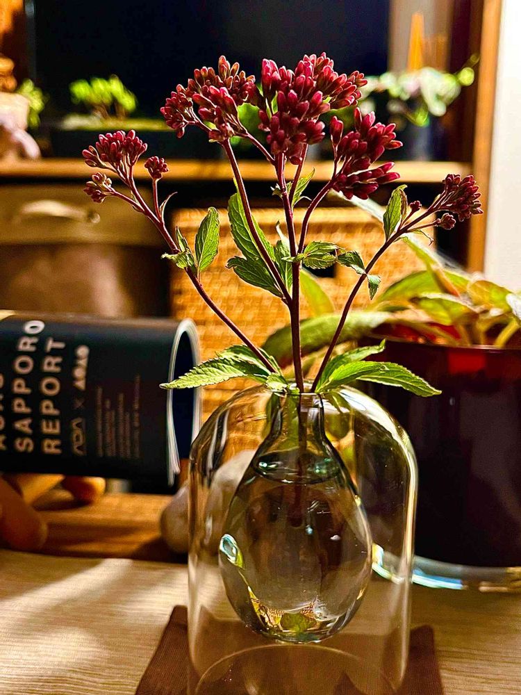 透明な花器にちょっと渋そうな赤色のフジバカマがシックで良い感じ!ですね!