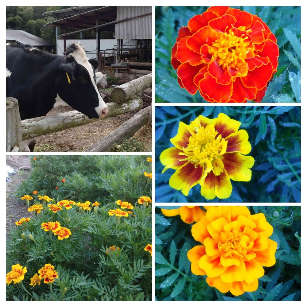 @tanisa さん。トウモロコシ植えた周りにマリーゴールド植えてたの。トウモロコシ猿にやられて抜いたのでマリーゴールドだけ残ったという😅😅トウモロコシまだまだ熟してないの、食べもせんともぎまくっただけという😱😱牛は出先です