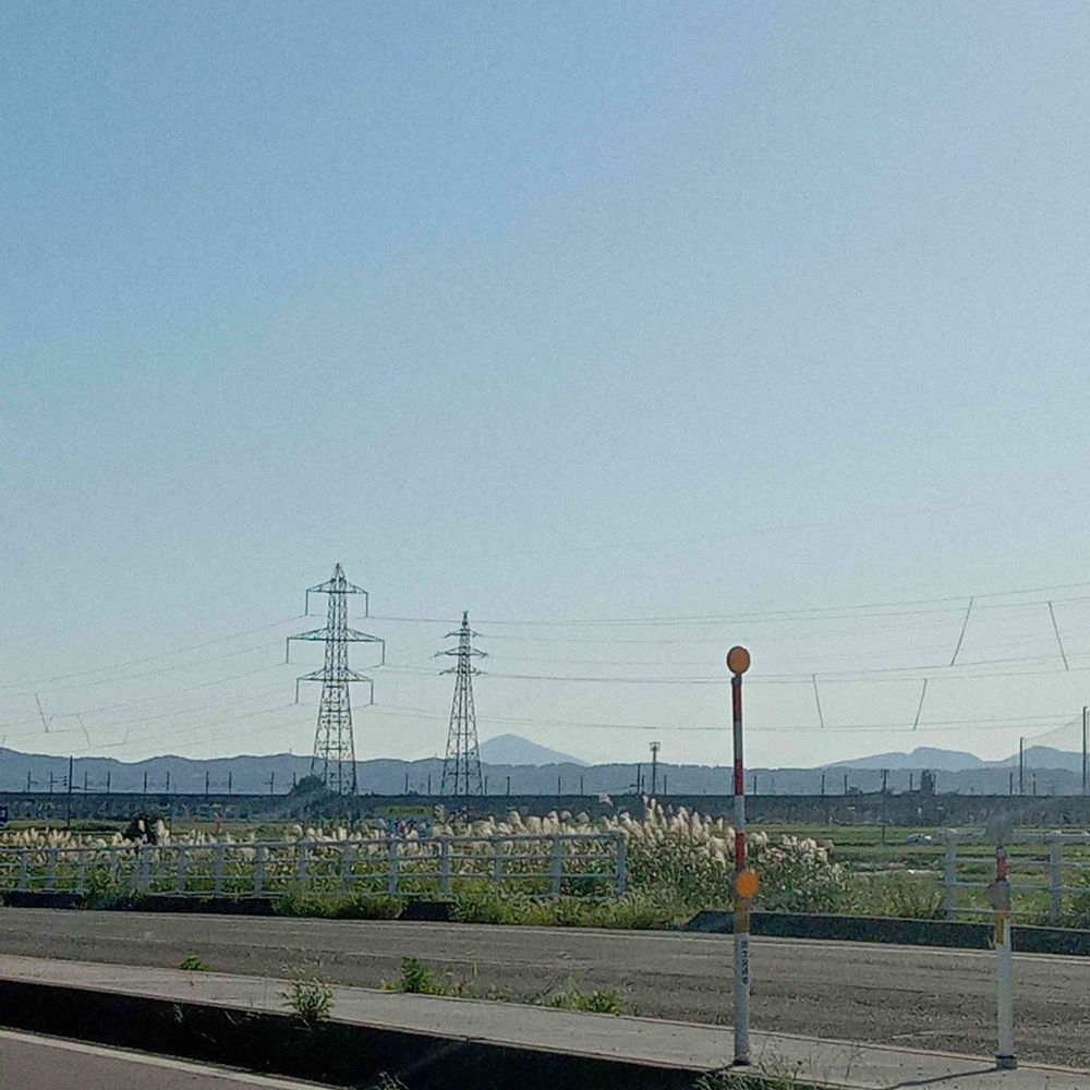 ススキ🌾の揺れる稲田や立ち並ぶ高圧鉄塔の遠くに綺麗な形の山が見える・・・
