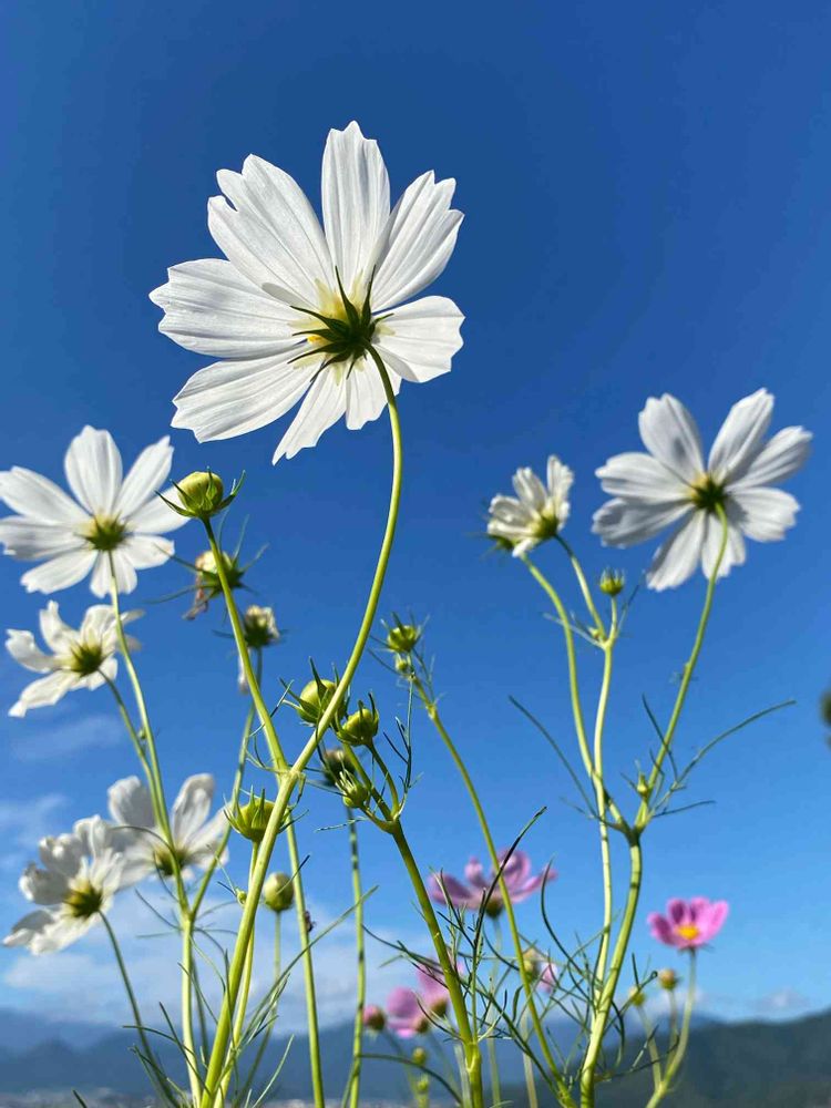 真っ青な空に白のコスモスが素敵にマッチしています。