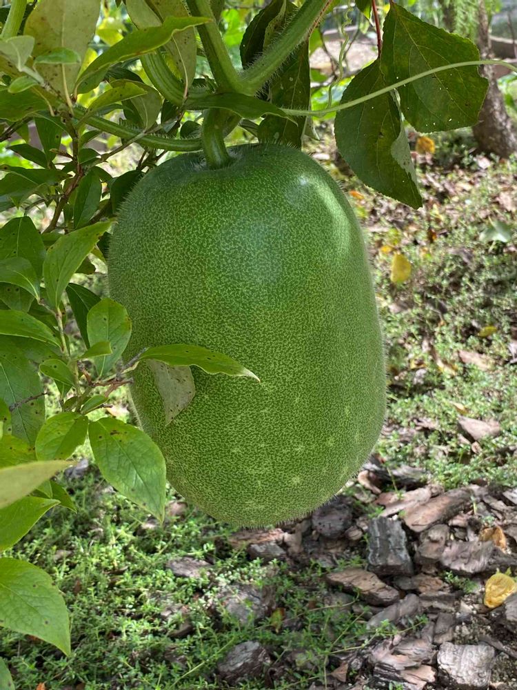 雄花ばかりだよねと話しながら、ひょいとかがんでみたら大きな実が2つ、思わず声が出てしまいました😱