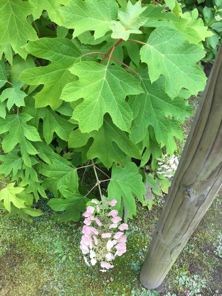 この柏葉アジサイの名前は、スノークイーンといいます。一重咲きです。