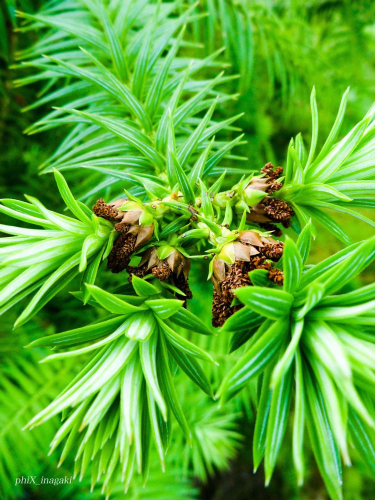 キャンパスの植え込みにとがった松ぼっくりの小さいような実?がなるトキトキの木(コウヨウザン)を発見。よく見ると花が咲いていて居て,花が終わると件のとがったヒダの松ぼっくり状になるようです。