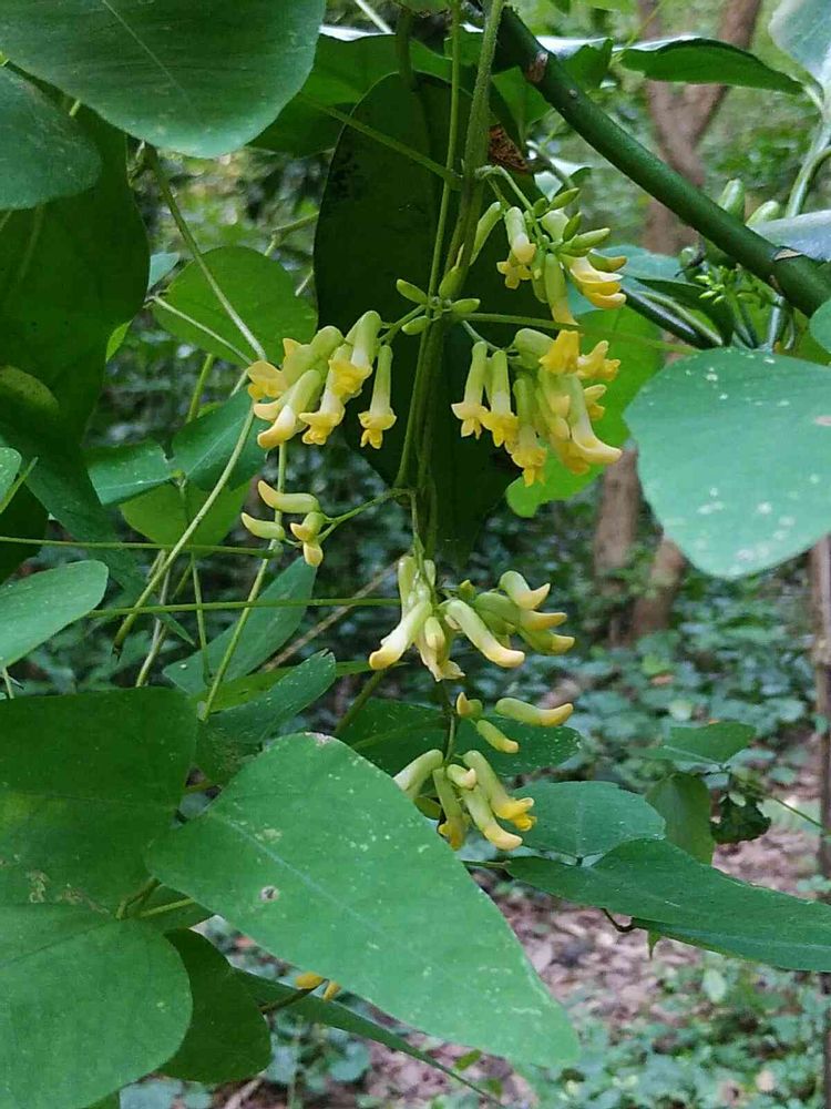 つるについた淡い黄色の蝶形の花が、沢山、ぶら下がっていました。