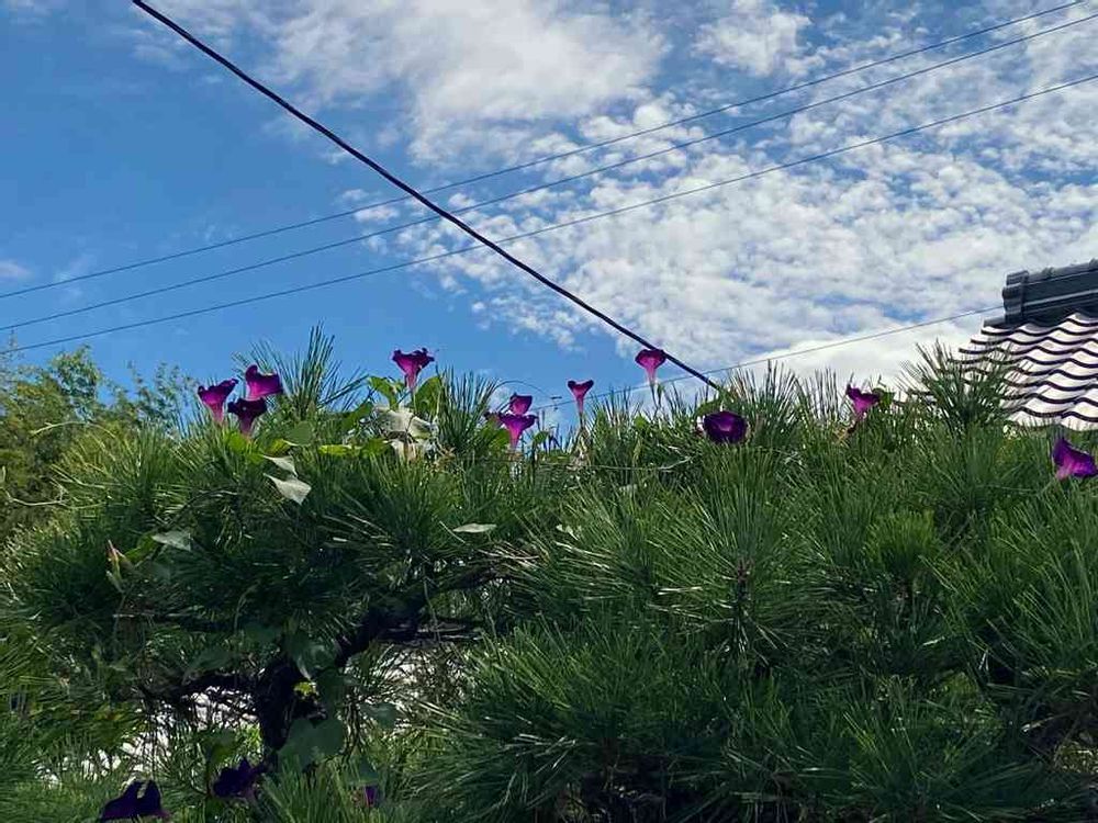 松に這わせた実家の丸葉朝顔、油断したらてっぺんから顔を出して咲いていた