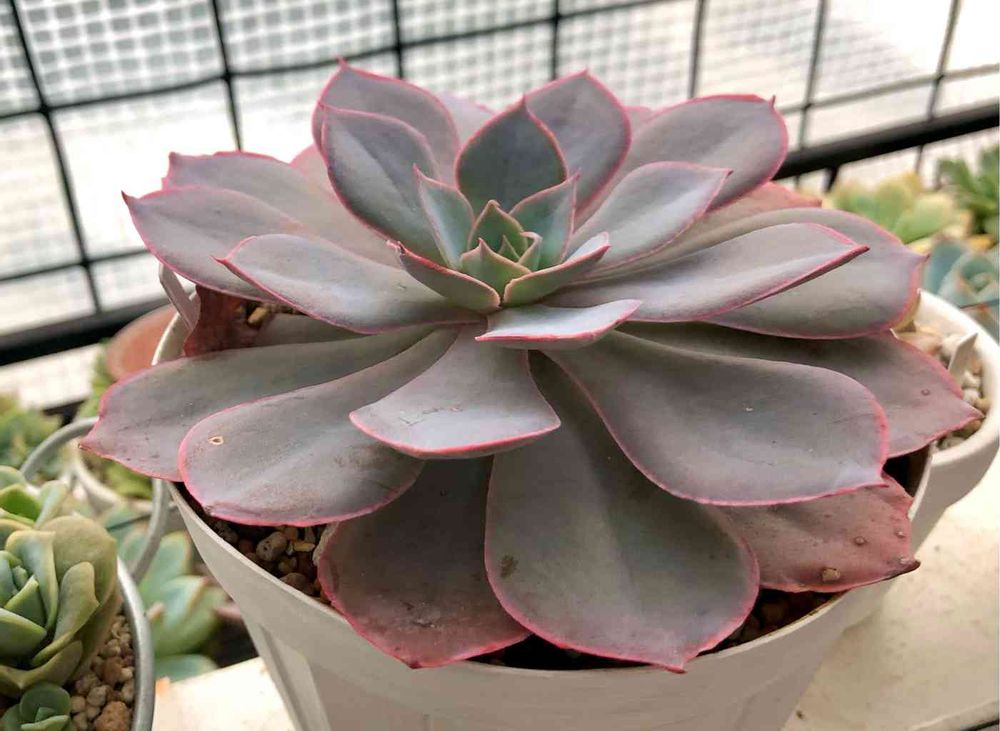 パープルトーンにホワイトパウダーをまとった大ぶりの丸葉っぱを広げるエレガントな品種。