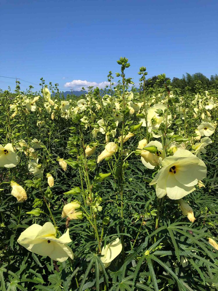 トロロアオイ(花オクラ)が見ごろを迎え、凄い株数が群生し圧巻の光景に驚きでした。