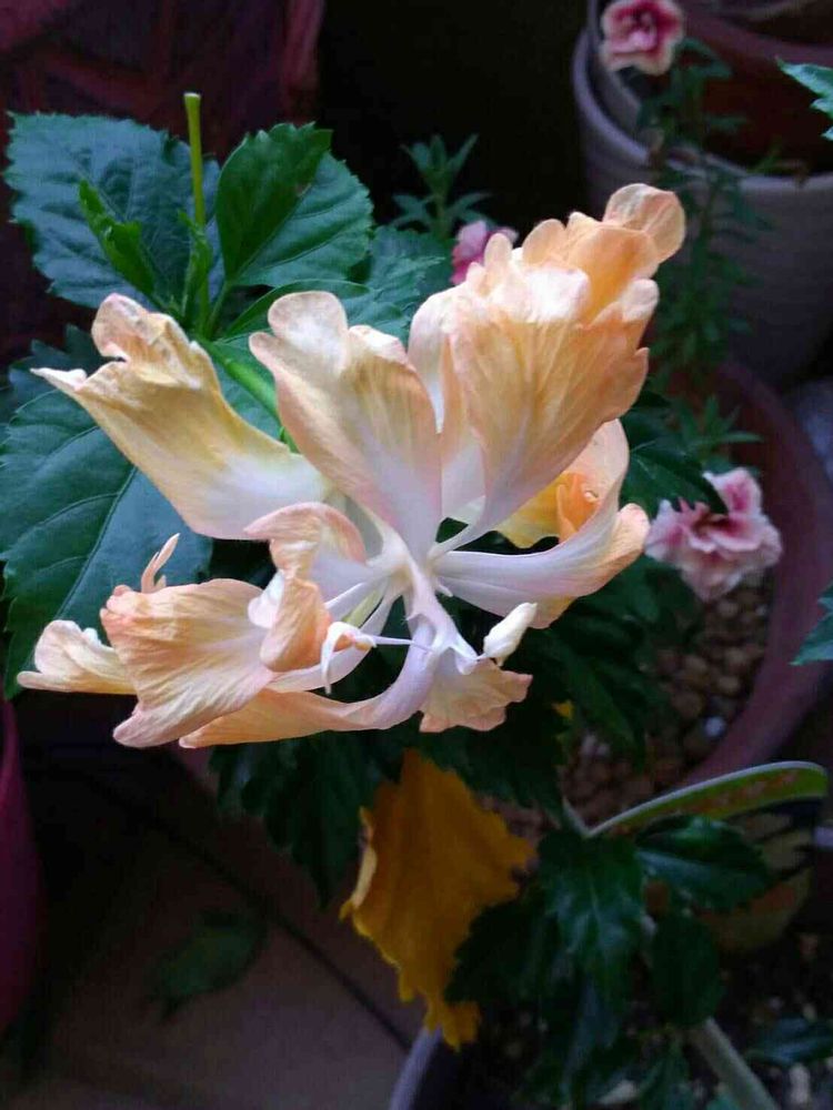 優しい色でちょっと変わった咲き方のハイビスカス🌺