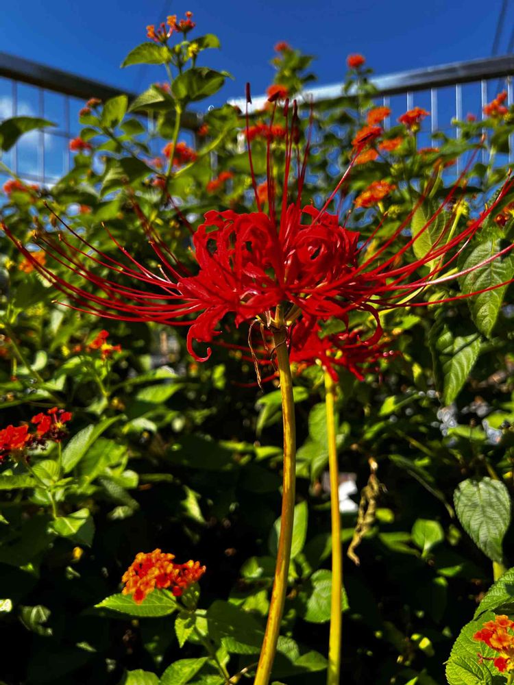 ランタナのあいだから彼岸花がさいて居ます。今年は少し遅い開花になりました。