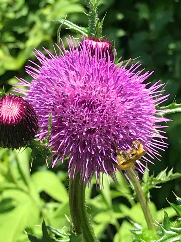白山高山植物園で咲いていたアザミに🐝がとまり蜜を吸っていましたが、カメラおじさま方の順番待ちしている間に下に潜ってしまいました😅