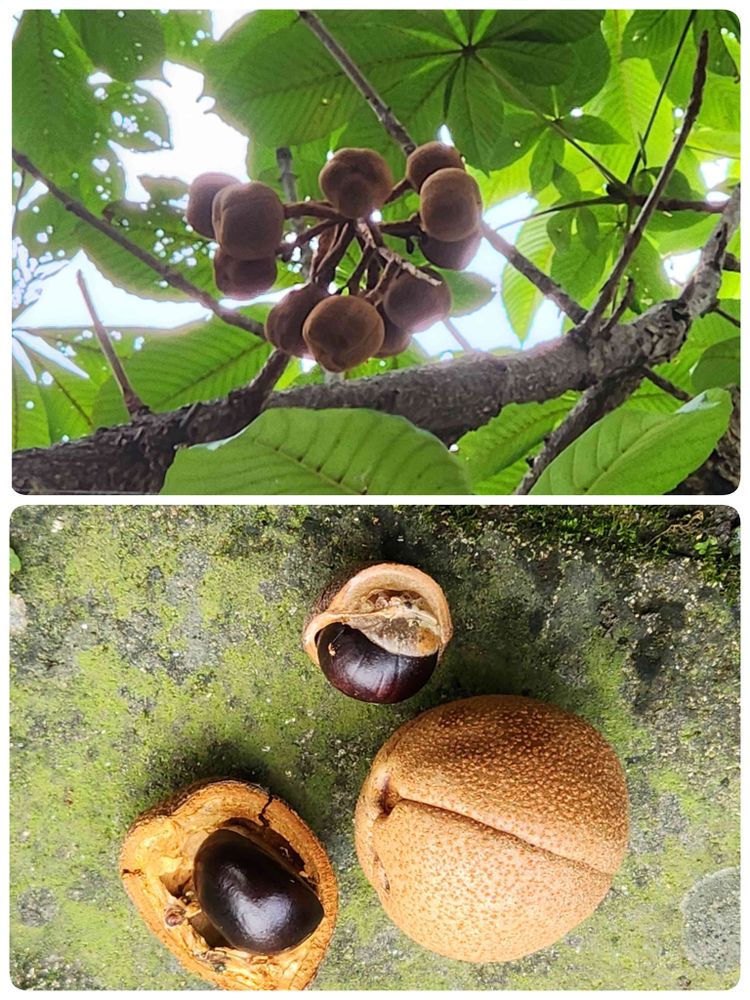 久しぶりに徳島公園に行ったらトチノキの実が落ちていました。上を見あげたらまだ木に残っていました。