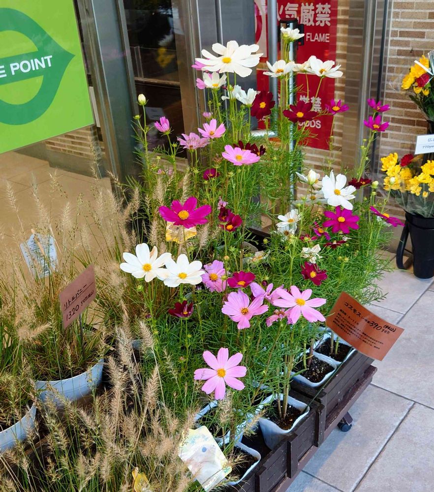 お早うございます。花屋さんにはコスモスが並んでいます。