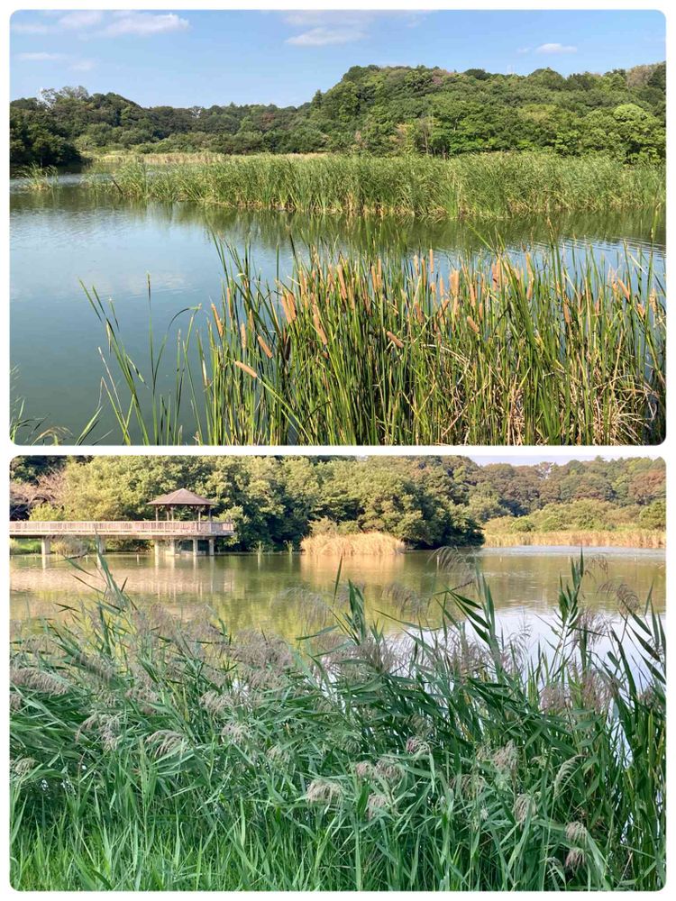 千駄堀池の周りに自生する「ガマ」と「ヨシ」の穂に秋を感じた。