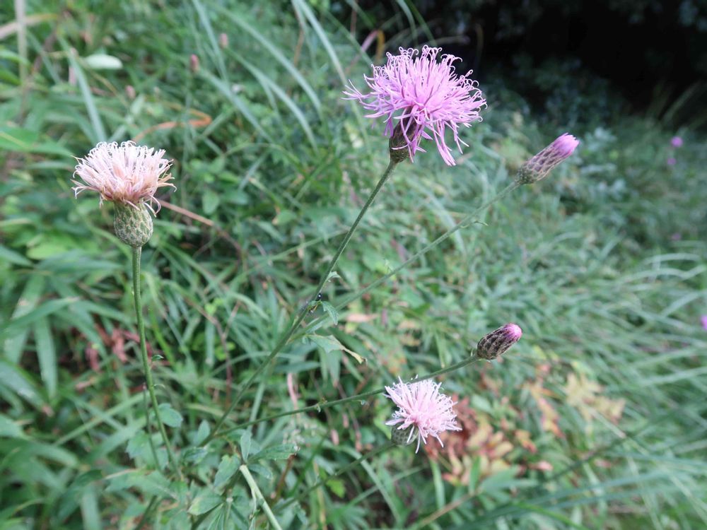 市内の田園風景の中、土手にタムラソウが見頃でした。真ん中が普通の花色、アザミと同じ色、右左に少し白い花をつけたもの。この色のものは珍しい。✌️🐶