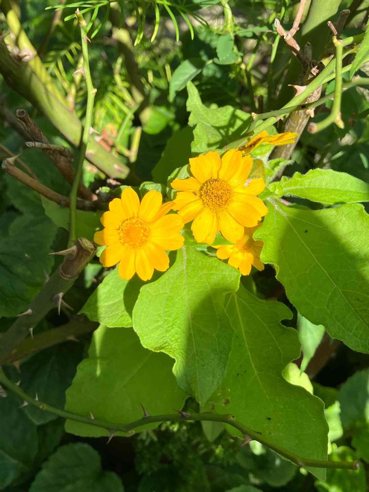 ぎゅうぎゅうの鉢植えに滑り込んでた昨年の種 メランポジュームが今頃咲き出しました 朝日浴びて可愛い💕