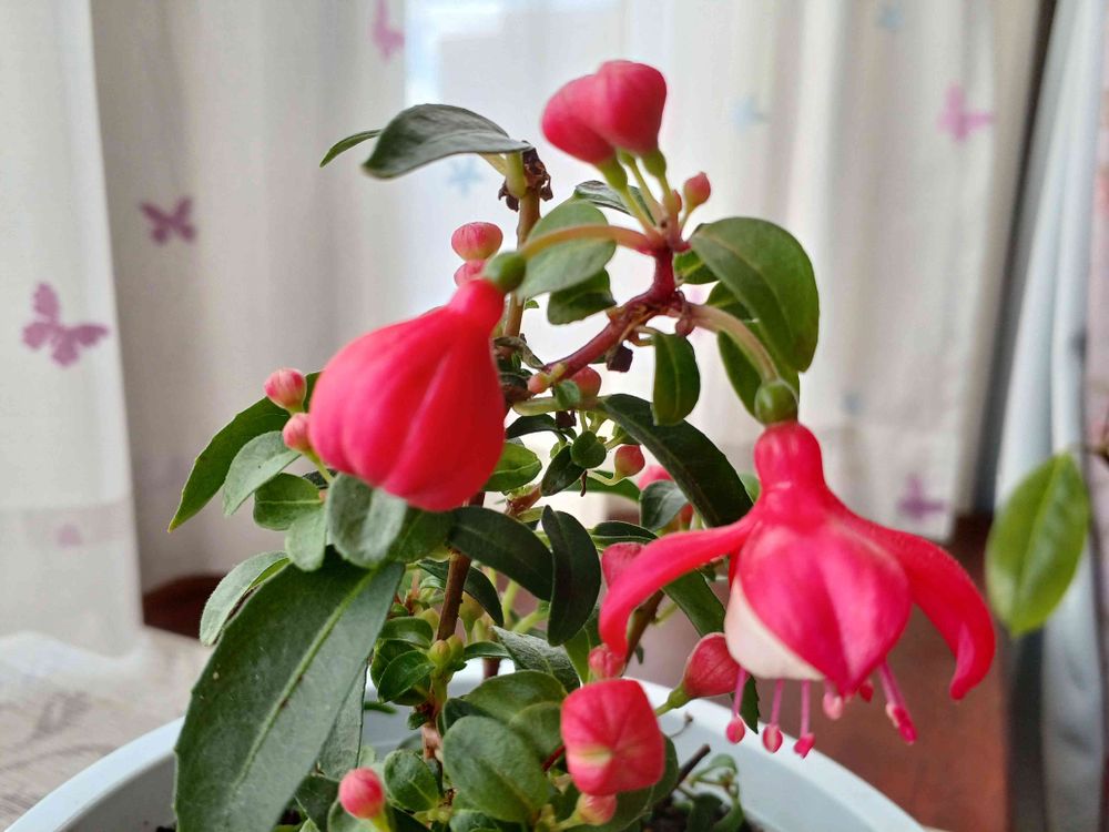 朝晩寒くなってきたのでおうちの中に入れたフクシア🌼