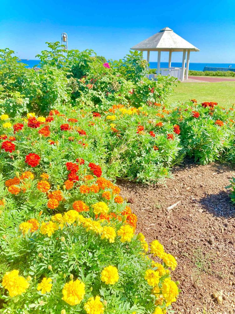 初秋の道東旅③紋別の海辺🏝️マリーゴールドの奥はハマナス🌺✨白いあずまやの奥は真っ青なオホーツク🌊まだまだ夏を思わせる雲一つない青空🩵と爽やかな海風🎵