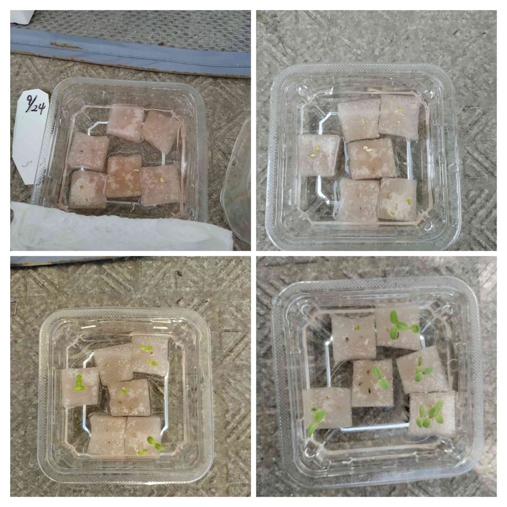 右上:9/28(木) 伸びてきたので、キッチンペーパーを外して育てる事に。