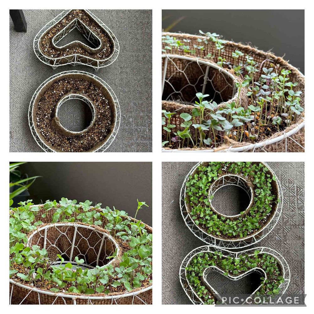 種も均等に播けて、順調。心持ちもう少し土があっても良いのかな🤔位です。2つで5袋、何粒位でしょう!?ちょうど良さそうな茂り具合。うちにもハート♡のリース有ります。来年試してみたくなりました。成長、楽しみにしてますね💓