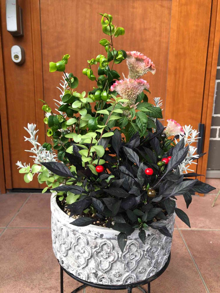 セロシアと観賞用とうがらし、リーフを使った寄せ植え♪