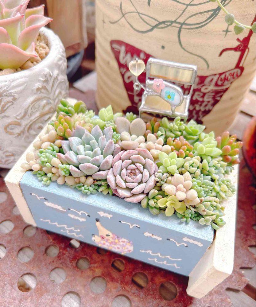 花ネズミちゃん木箱に寄せ植えしました〜🤗💕💕✨