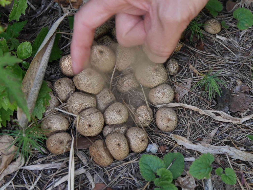 タヌキノチャブクロ。ホコリタケの仲間、成熟すると頭に穴が開きそこから胞子を飛ばします。試しに指で弾くと、このとおりホコリのような胞子が舞い散る。🍄なお出たばかりでキノコが白い時は食用になります。過去に食した事があり、食感はハンペン、味は特に無し、炙って醤油をかけて食べました。これとキツネノチャブクロは、毒キノコ🍄と間違いにくいキノコです。自信のない方はマネしないでね。😄