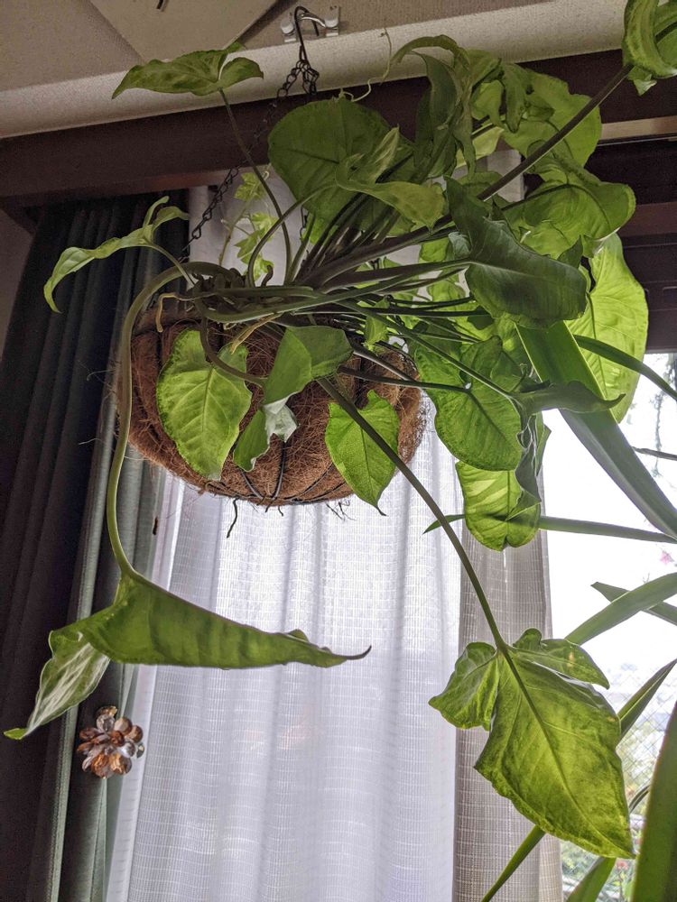 ハンギングにしているシンゴニウム ホワイトバタフライは、若干つる植物感が出てきました。
