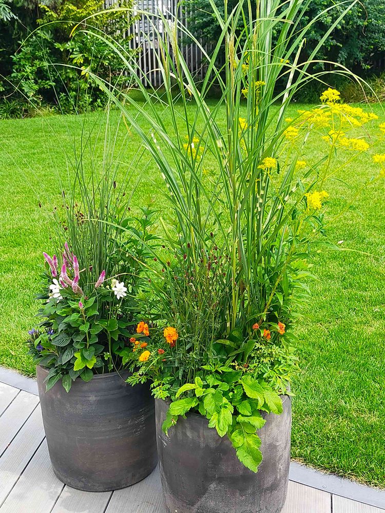 芝生前の寄植えポット