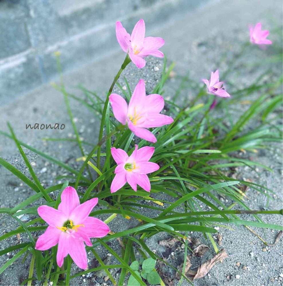 去年、ブロック塀横の砂地に球根を植えたピンクのタマスダレ🌸