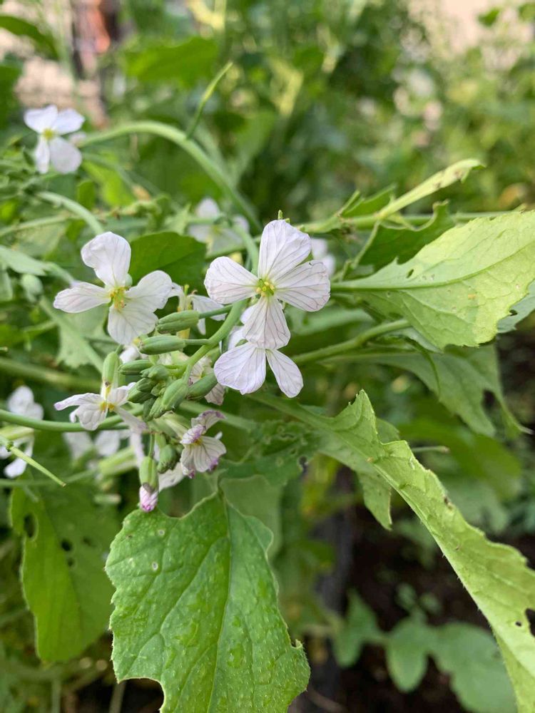 時期がすぎて放置していた大根からもしゃもしゃ茎が伸びてお花が咲いていました🌸