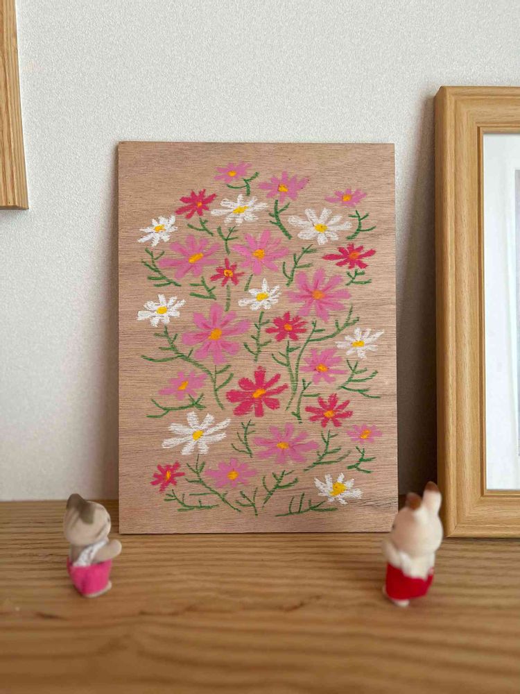 ベニヤ板にコスモスを描きました。