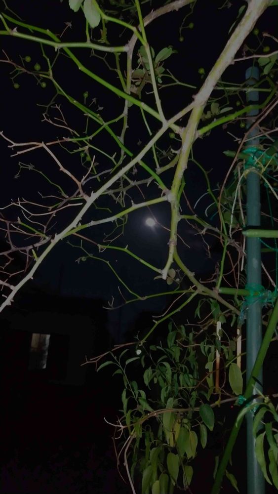 つるバラ バレリーナとヤマホロシの間から見た月。