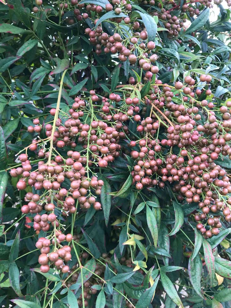 母の墓参りに行ったお寺で、南天の実が、たわわに実っていました。