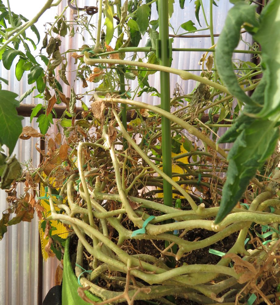 ミニトマトの茎から大量の気根が生えてきています。