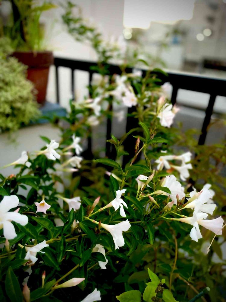 サンパラソルビューティーのパールホワイトがどんどんつるを伸ばして綺麗に咲き出しました❣️