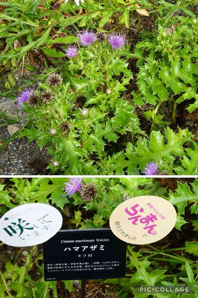 これは「ハマアザミ」ですけど、終わったばかりの"らんまん"人気にあやかって、「咲いてます」「らんまんで紹介されました」のダブルラベル貼りです‼️😆