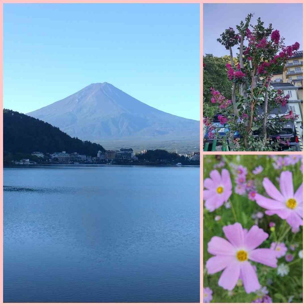 河口湖湖畔にはエンジ色の百日紅、コスモス🌸が綺麗に咲いてました🎵